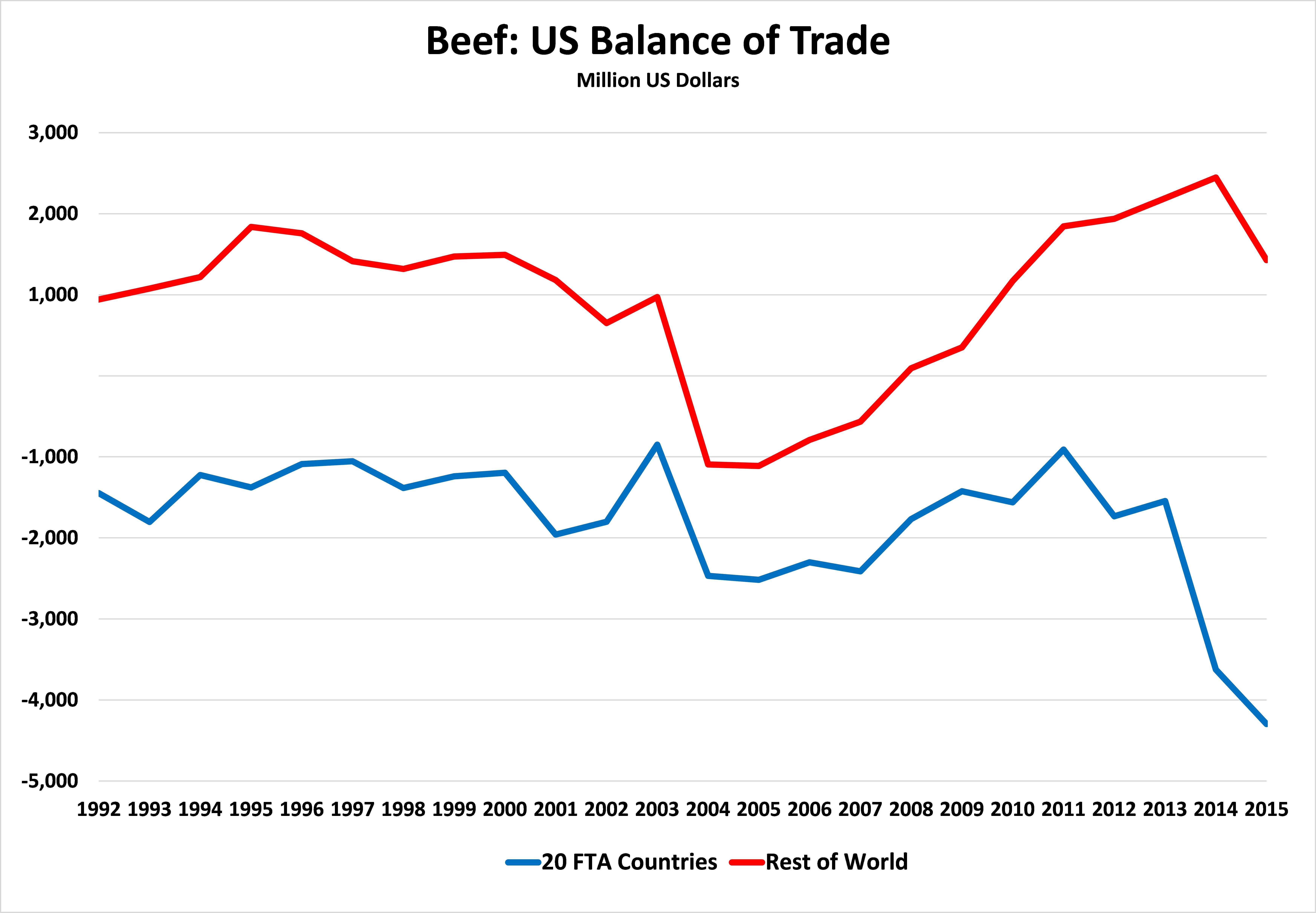 Figure 1. US balance of trade in bovine products, comparing 20 countries with which the US has an FTA with the countries in the rest of the world, 1992-2015. Data source: US Department of Commerce, Census Bureau, USA Trade Online (http://tinyurl.com/jsltwao).