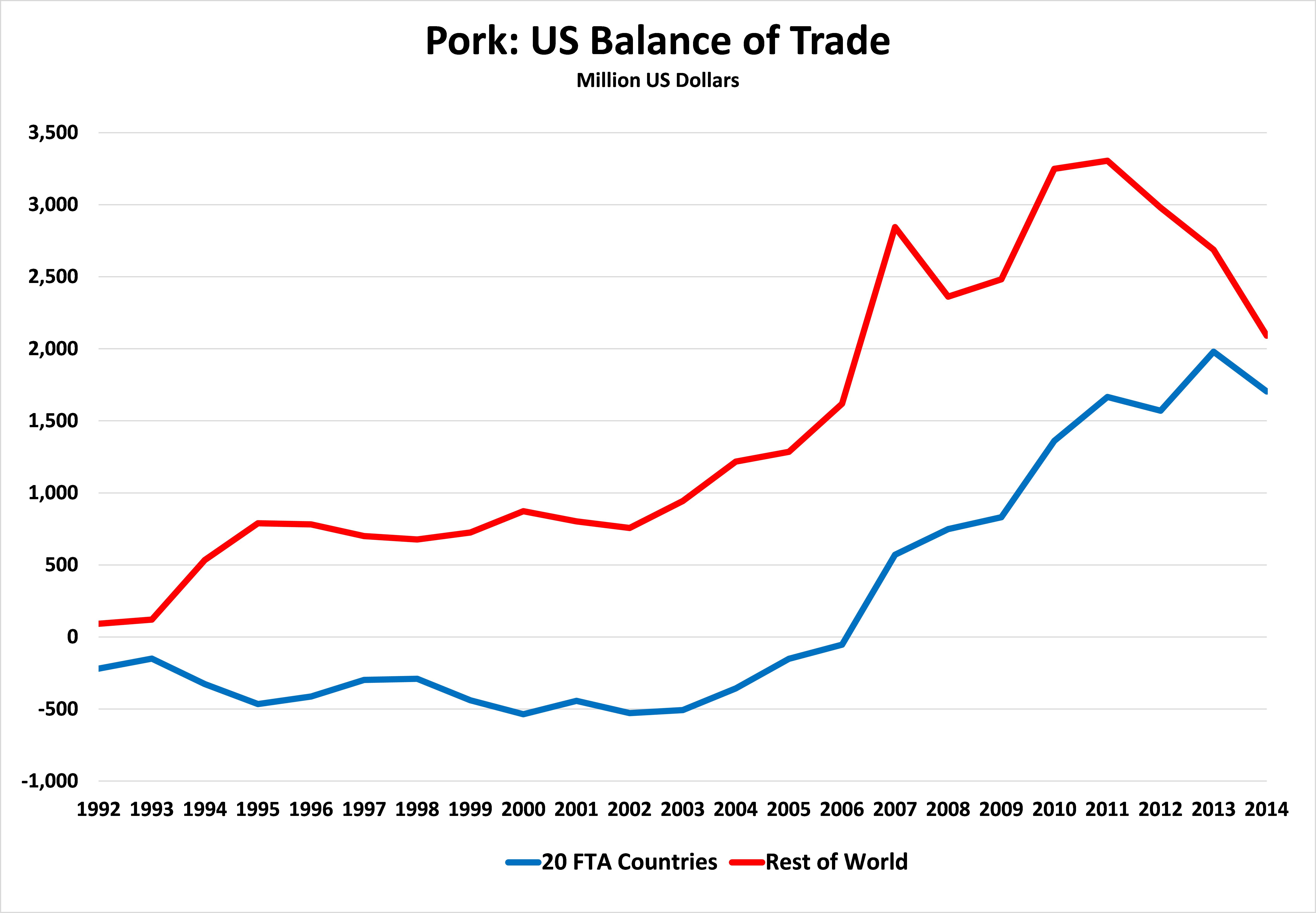 Figure 2. US balance of trade in pork products, comparing 20 countries with which the US has an FTA with the countries in the rest of the world, 1992-2015. Data source: US Department of Commerce, Census Bureau, USA Trade Online.