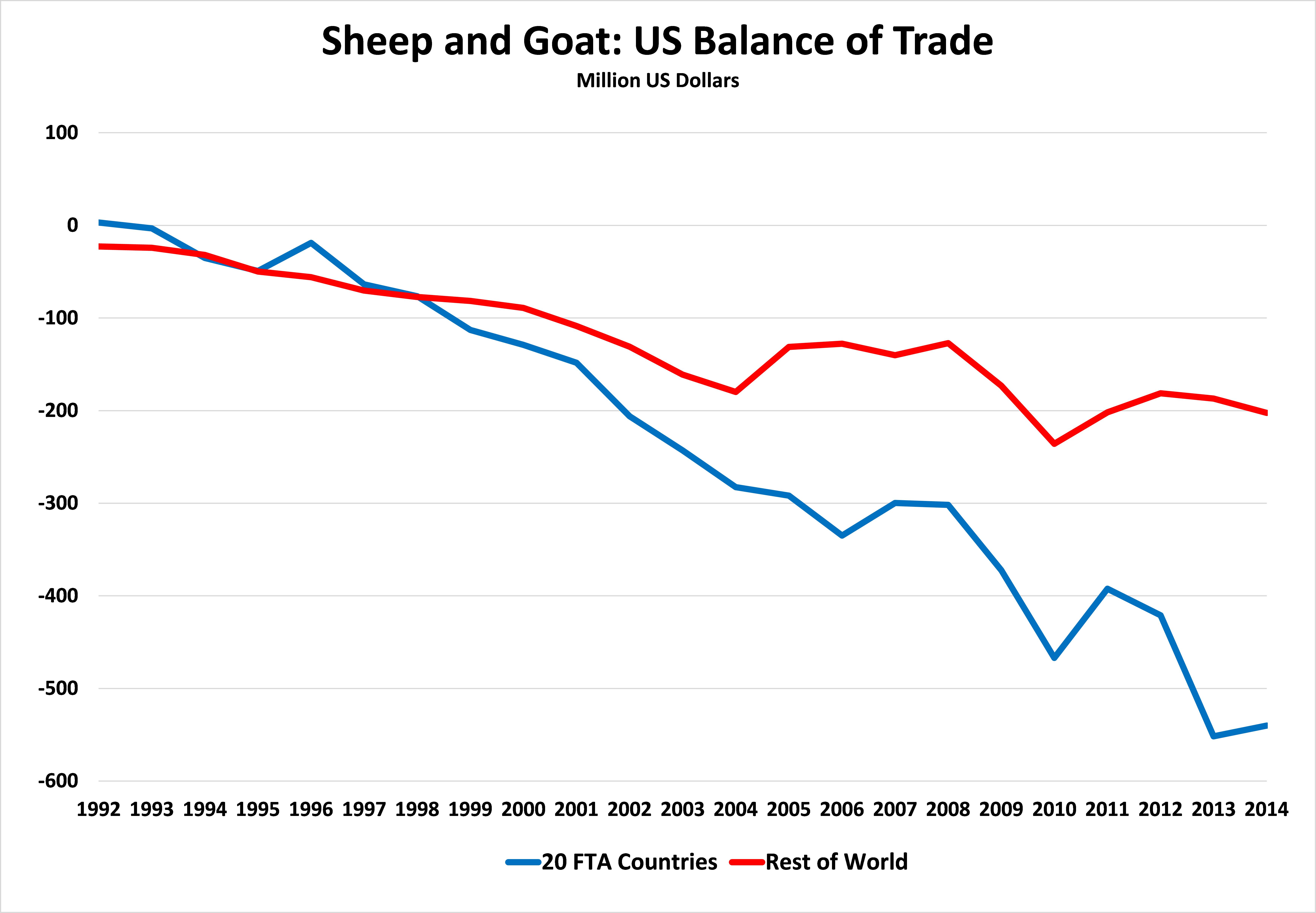 Figure 3. US balance of trade in sheep and goat products, comparing 20 countries with which the US has an FTA with the countries in the rest of the world, 1992-2015. Data source: US Department of Commerce, Census Bureau, USA Trade Online.