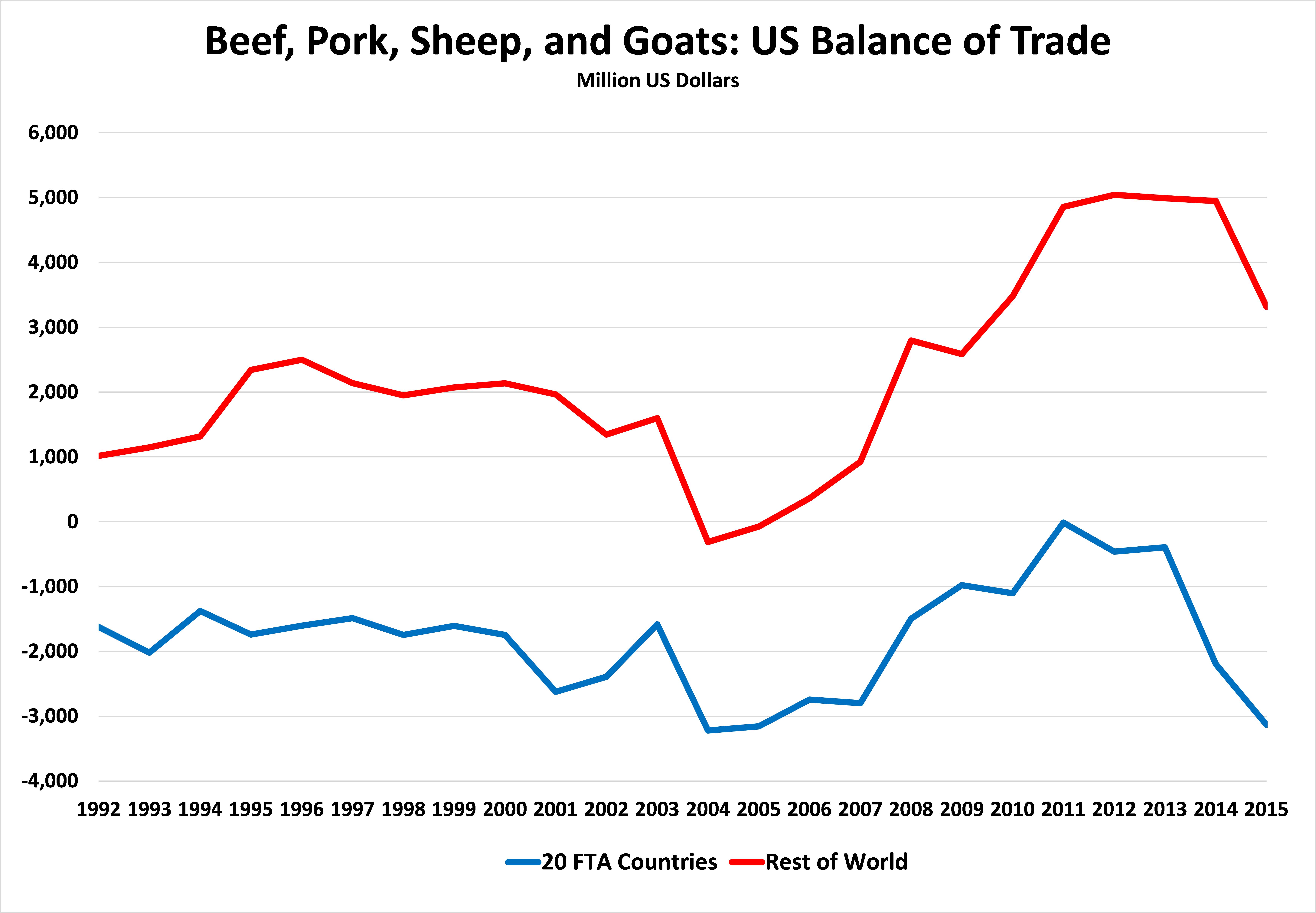 Figure 4. US balance of trade in beef, pork, sheep, and goat products, comparing 20 countries with which the US has an FTA with the countries in the rest of the world, 1992-2015. Data source: US Department of Commerce, Census Bureau, USA Trade Online.